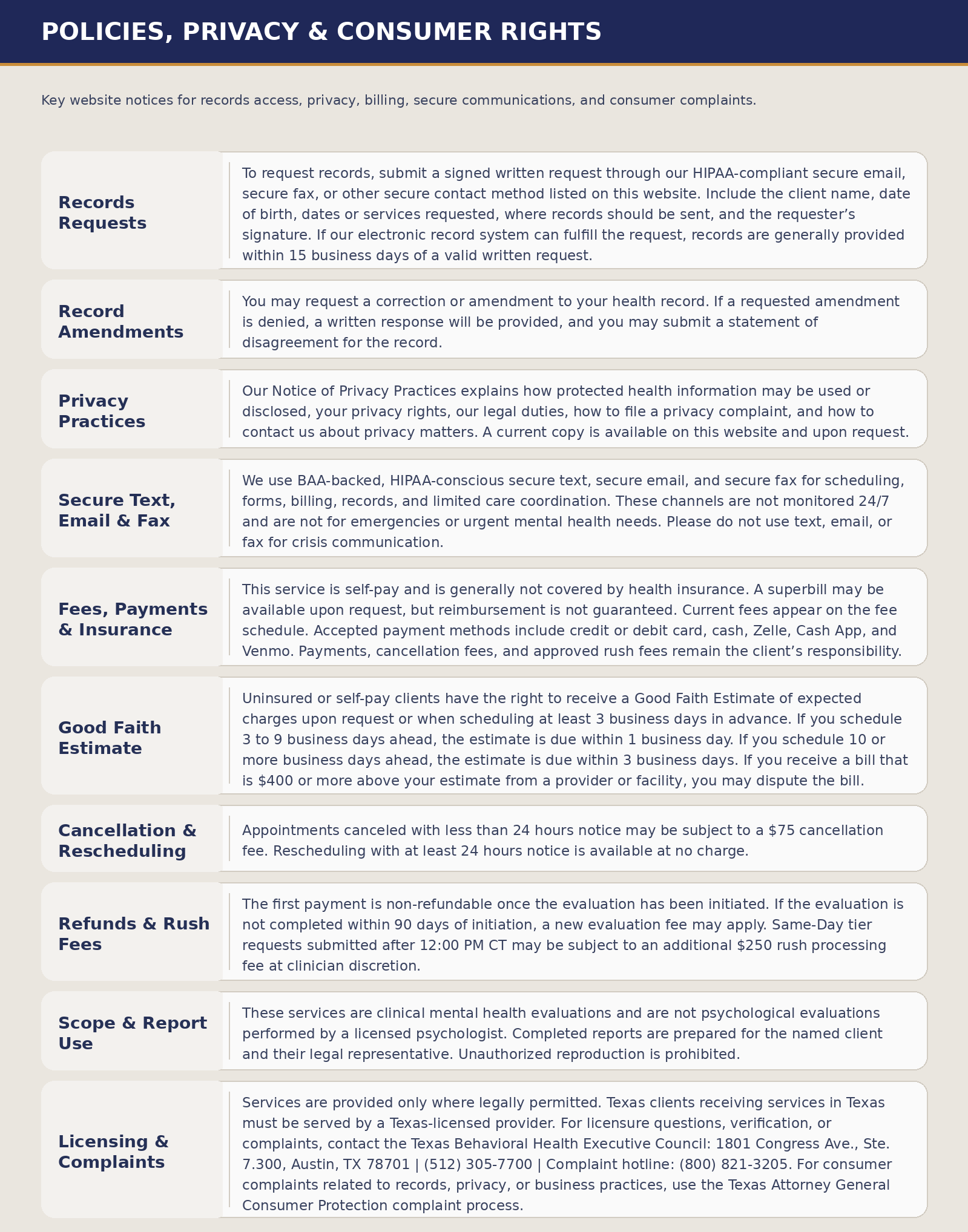 We use secure, BAA-backed, HIPAA-conscious text, email, and fax systems for scheduling, billing, forms, records exchange, and limited care coordination. These channels are not monitored 24/7 and should not be used for emergencies or urgent mental health needs. If you choose to communicate electronically, we will use reasonable safeguards to protect your information.